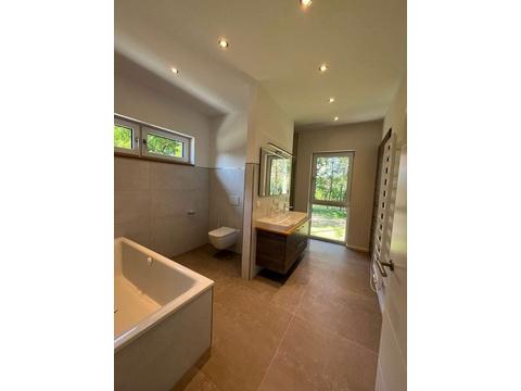 Ein überaus stilvoll ausgestattetes und exzellent durchdachtes Bad mit geräumiger Dusche, Handtuchwärmer und hochwertigen Einbaumöbeln erwartet Sie im Obergeschoss und wird zukünftig zu Ihrer persönlichen Wellness-Oase.