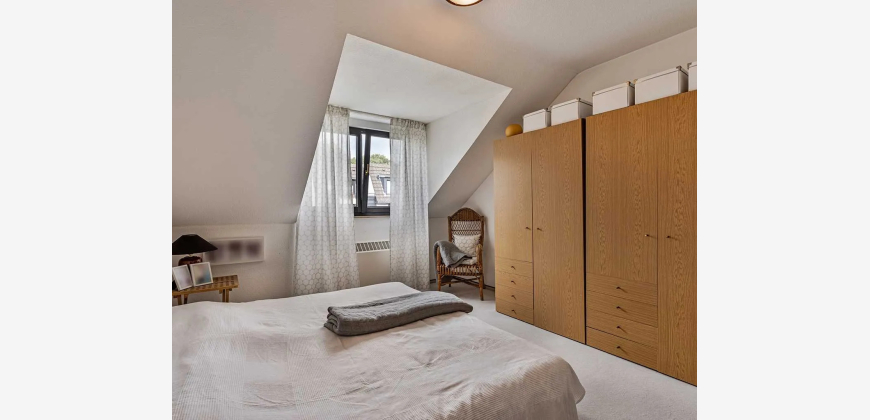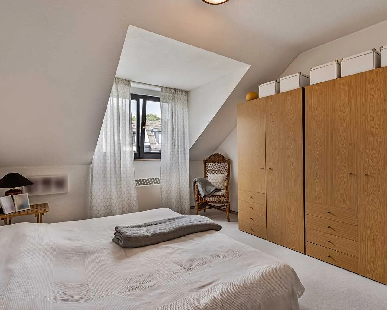 Das Schlafzimmer ist ruhig gelegen und bietet ausreichend Platz für ein Doppelbett und Kleiderschränke. Das Wannenbad mit Platz für die Waschmaschine, sowie die kleine Abstellkammer im Flur runden das Raumangebot ab.