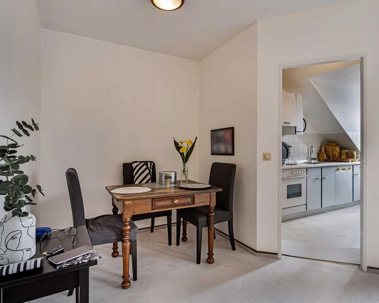 Beim Betreten der Wohnung gelangen Sie in einen kleinen Flur, der zu allen Räumen führt. Das helle Wohnzimmer mit Essecke lädt zum Entspannen ein und bietet den Zugang zum sonnigen Balkon in Südausrichtung. Angrenzend befindet sich die Küche.