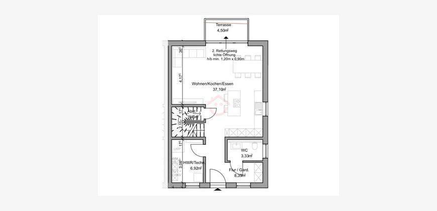 Der Mittelpunkt des Erdgeschosses ist der großzügige Wohn-, Koch- und Essbereich. Die offene Gestaltung sorgt für ein modernes Wohngefühl und viel Tageslicht. Von hier aus haben Sie direkten Zugang zur Terrasse, die zum Entspannen und Verweilen im Freien einlädt.