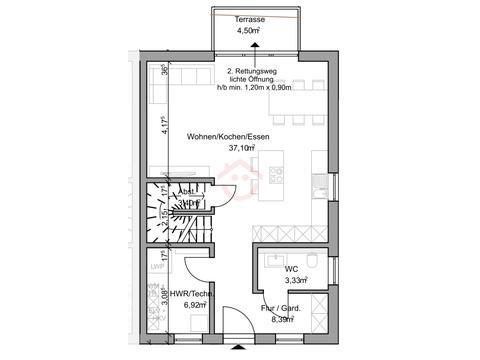 Über den Eingangsbereich gelangt man in den Flur, von dem aus alle Bereiche des Erdgeschosses bequem erreichbar sind. Auf der linken Seite befindet sich der praktische Hauswirtschafts- / Technikraum mit ausreichend Platz für Haustechnik, Waschmaschine und zusätzlicher Stauraum. Auf der rechten Seite liegt ein separates Gäste-WC mit Fenster.