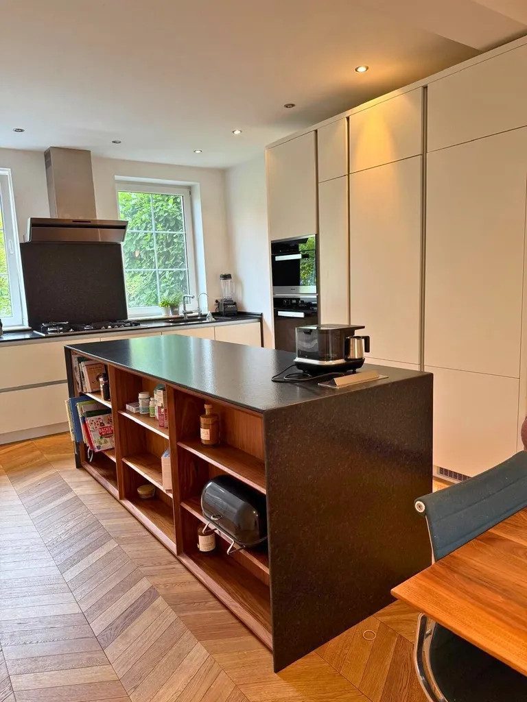Zentraler Treffpunkt des Hauses ist die ca. 30 m² große Wohnküche mit einer exklusiven Einbauküche und Miele-Geräten - offen, elegant und perfekt für gemeinsames Kochen und Leben. Ein Hauswirtschaftsraum im Erdgeschoss ergänzt das durchdachte Raumangebot sinnvoll.