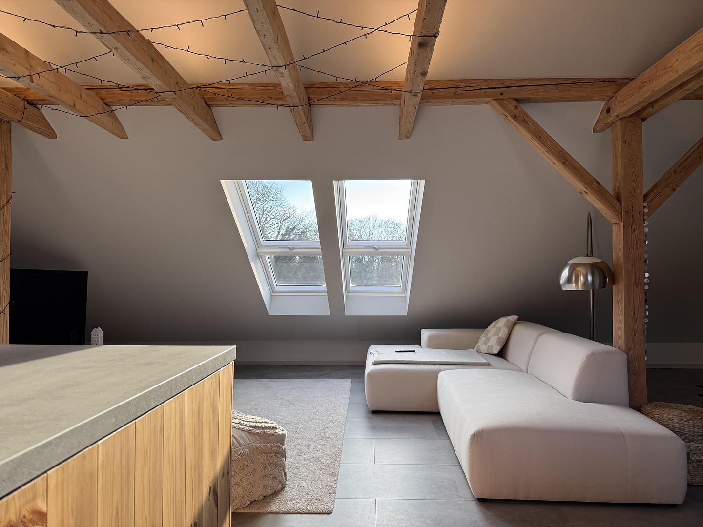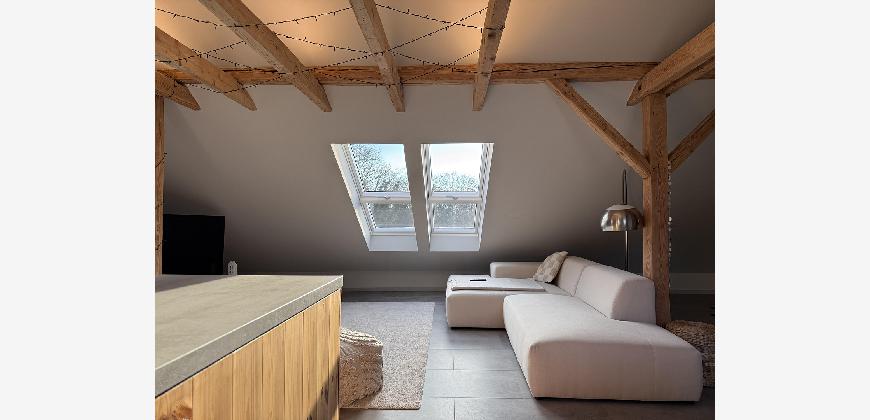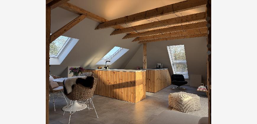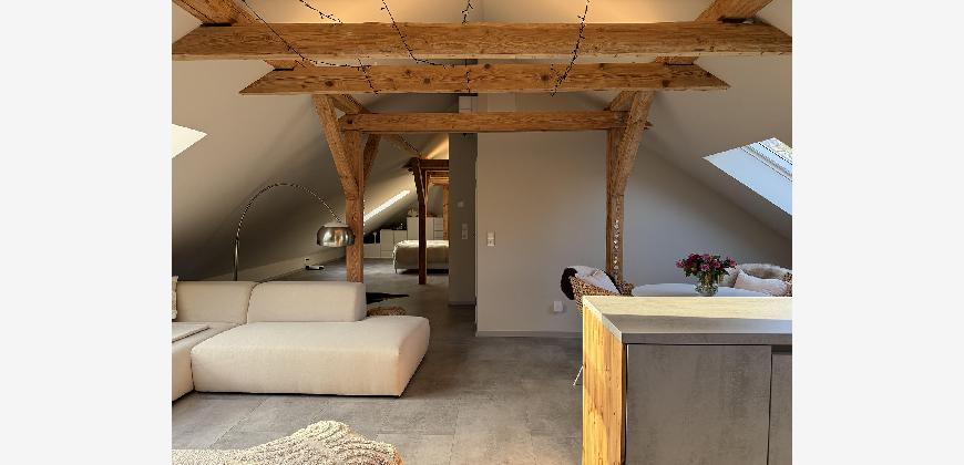 - Sichtbare, hochwertig aufgearbeitete Holzbalkenkonstruktion