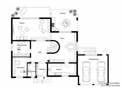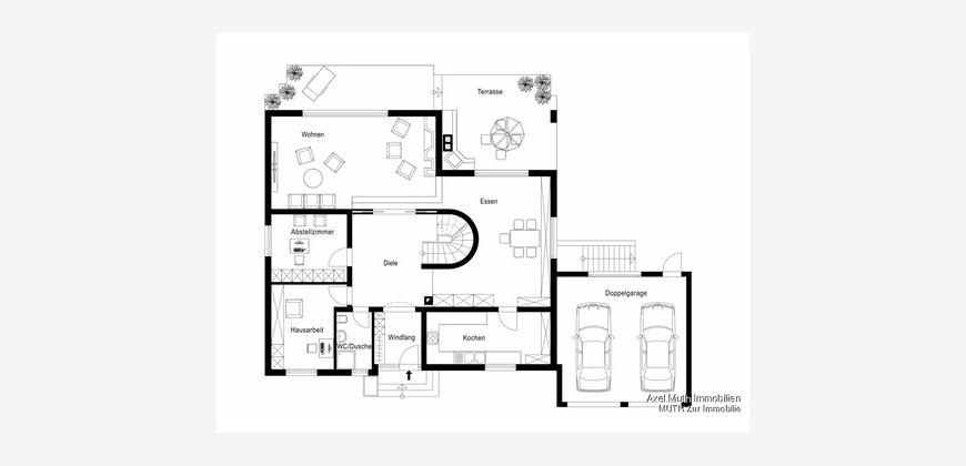 Auch die Stellplatzsituation lässt keine Wünsche offen: Eine großzügige Doppelgarage bietet Platz für zwei Fahrzeuge, zwei weitere Stellplätze befinden sich direkt davor sowie ein zusätzlicher Stellplatz unmittelbar vor dem Haus.