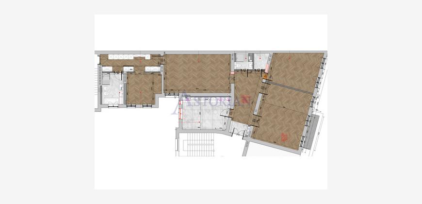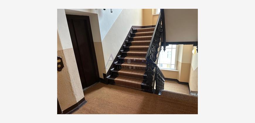 Der Eingangsbereich ist weitläufig und verleiht der Wohnung ein repräsentatives, einladendes Ambiente. Ein zusätzlicher Zugang über ein separates Treppenhaus dient als weiterer Zutritt oder als Notausgang. Ein Aufzug im Vorderhaus führt bis zur vierten Etage und erleichtert damit den Zugang zur Wohnung deutlich.
