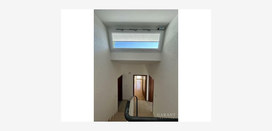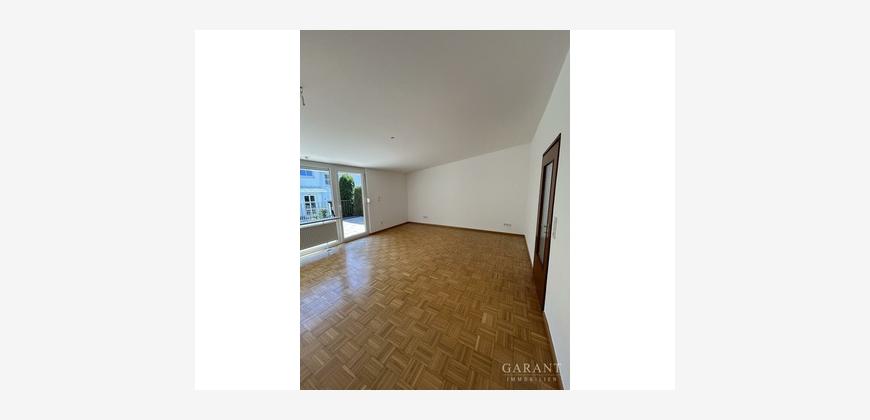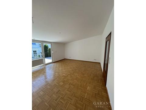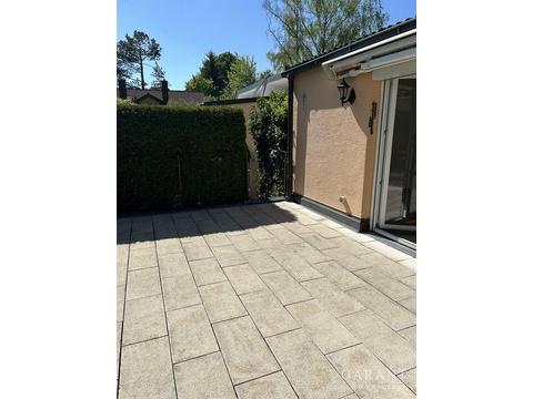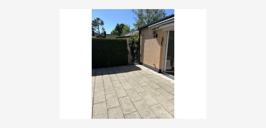 Auf der Eingangsebene befindet sich neben der Küche (ohne Einbauküche) ein Esszimmer sowie eine kleine Garderobennische. Geht man wenige Stufen nach oben, gelangt man in ein lichtdurchflutetes Wohnzimmer mit Zugang zur großen Südterrasse. Diese lädt zu vielen schönen Stunden im Freien ein. Eine elektrisch ausfahrbare Markise spendet an sonnigen Tagen Schatten. Seitlich von der Terrasse führen wenige Stufen hinab in den kleinen, gut eingewachsenen Gartennanteil.