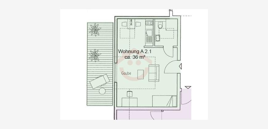 Mit einer Wohnfläche von ca. 36 qm bietet die Wohnung einen gut geschnittenen, offenen Wohnbereich, der Wohnen, Kochen, Essen und Schlafen harmonisch miteinander verbindet.