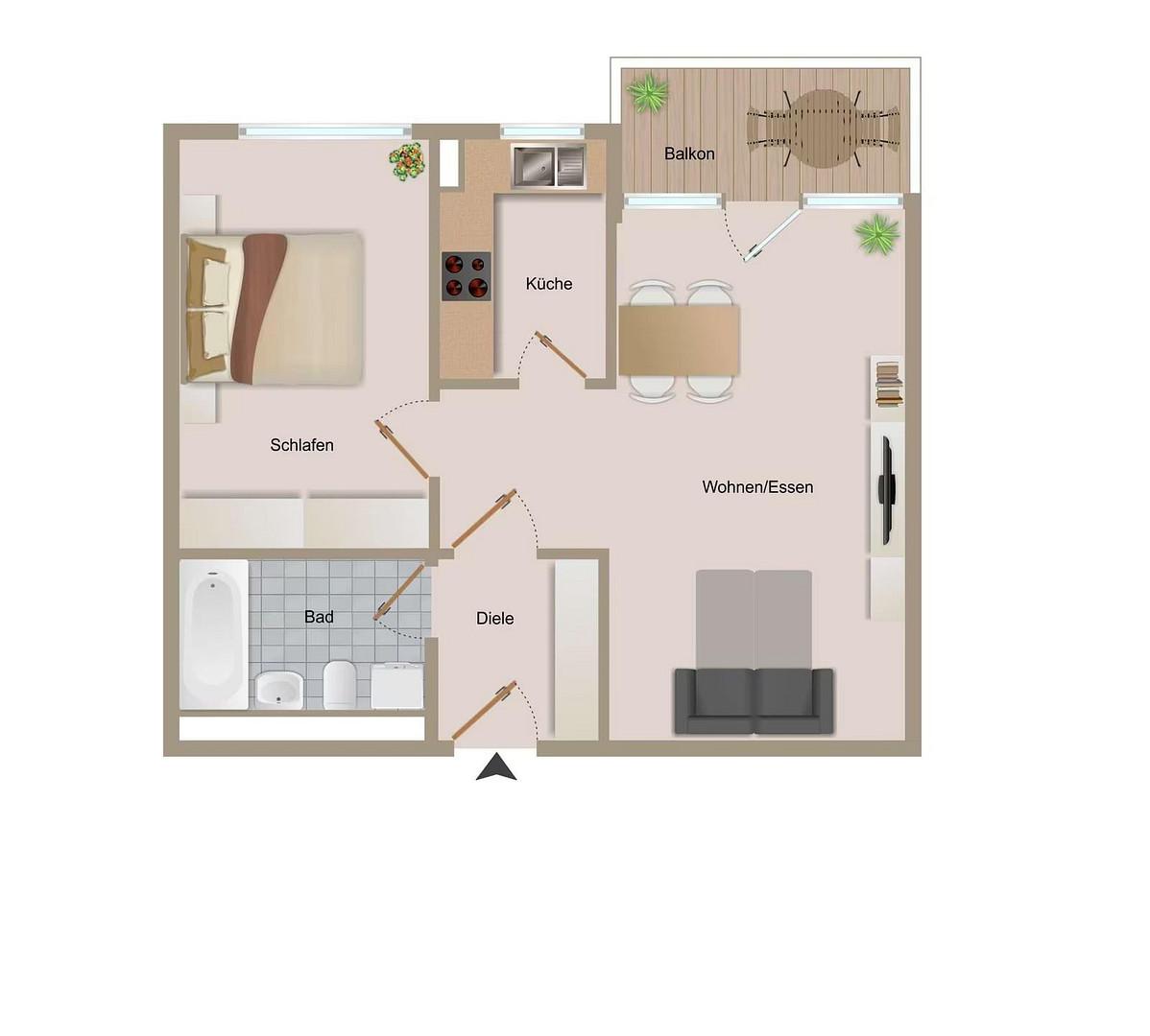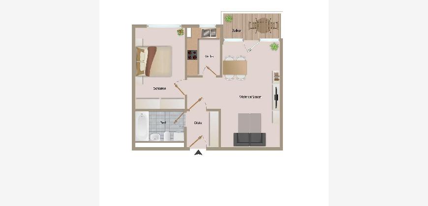Die moderne Wohnung liegt im Areal der „Grünen Mitte Essen“, eine zentrale Lage in der Essener Innenstadt und doch umgeben von zahlreichen Grünflächen und dem Rad- und Wanderweg der Rheinische Bahn. Vieles lässt sich zu Fuß oder mit dem Fahrrad erreichen.