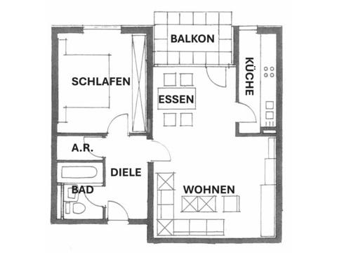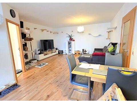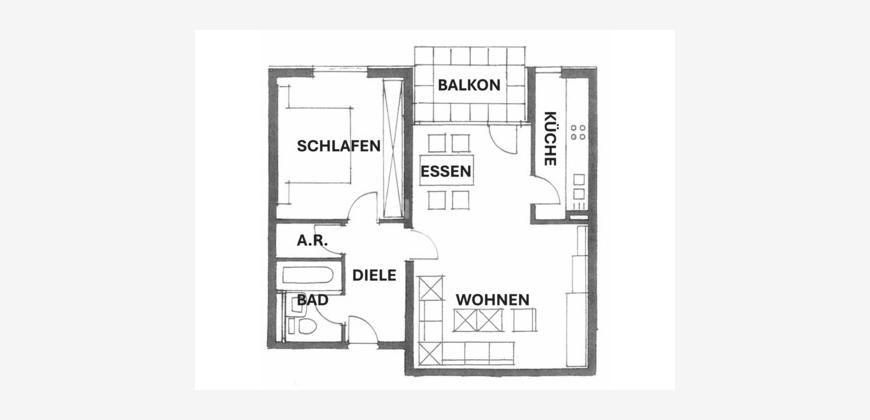 Auf der rechten Seite der Diele gelangen Sie in den großen, hellen Wohn- und Essbereich, der das Herzstück der Wohnung bildet. Große Fenster lassen viel Tageslicht herein und schaffen eine offene, einladende Atmosphäre. Ob gemütliche Abende auf dem Sofa, ein gemeinsames Essen oder ruhige Stunden mit einem Buch, dieser Raum passt sich Ihrem Alltag an. Von hier aus treten Sie auf den kleinen Balkon und genießen frische Luft und entspannte Momente im Freien.
