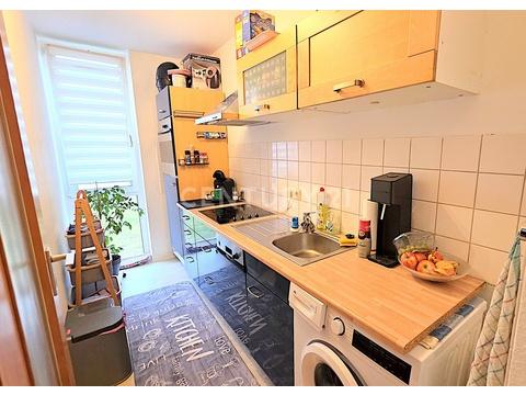 Angrenzend befindet sich die helle Küche mit Einbauküche, die alles bereithält, was man für den täglichen Bedarf benötigt. Eine Waschmaschine kann bei Bedarf selbst organisiert werden. Alternativ steht im Keller ein Gemeinschaftswaschraum mit Waschmaschine und Trockner zur Verfügung, die bequem über Münzen genutzt werden können, welche beim Hausmeister erhältlich sind.