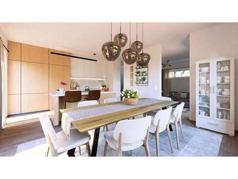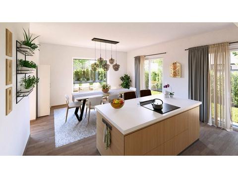 Das Herzstück bildet der großzügige, offene Wohn-, Ess- und Küchenbereich. Hier haben alle Platz: ob gemeinsames Kochen, gemütliche Familienabende oder fröhliche Spielrunden - alles geht nahtlos ineinander über, ohne dass die einzelnen Bereiche an Struktur verlieren. Die Küche ist dabei ideal neben dem Hauswirtschaftsraum angeordnet, sodass kurze Wege und viel Stauraum den Alltag spürbar erleichtern.