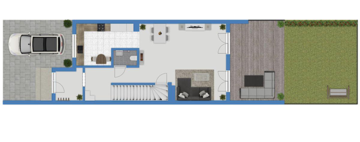 Das Erdgeschoss besticht durch ein helles, weitläufiges Wohnzimmer, welches mit bodentiefen Fenstern viel Tageslicht bietet und direkten Zugang zur Terrasse mit kleinem Garten gewährt. Eine moderne Einbauküche, die Diele, der Abstellraum sowie ein Gäste-WC runden diese Ebene ab.
