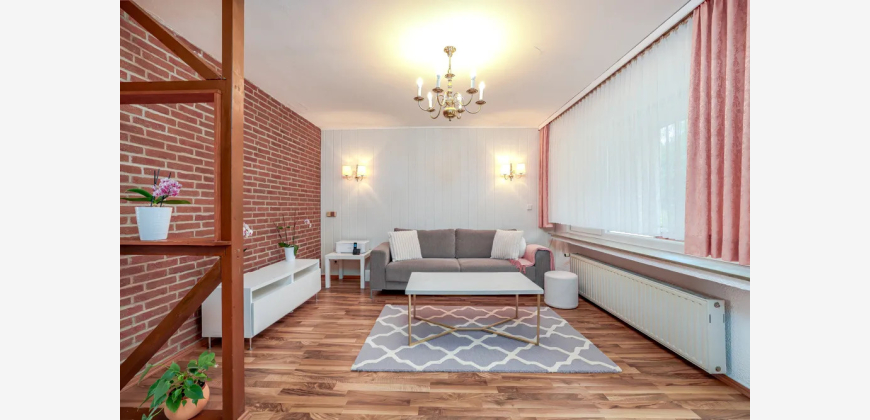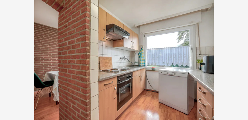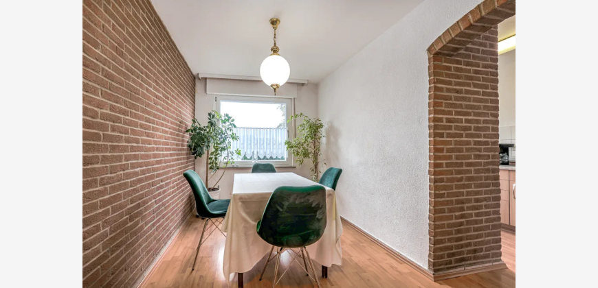 Im Erdgeschoss erwartet Sie eine offene und gemütliche Raumaufteilung. Die Küche ist durch einen rustikalen Türbogen aus Backsteinen vom angrenzenden Esszimmer getrennt ist. Der charmante Backstein-Stil setzt sich an einer Wand des Esszimmers fort und verleiht dem Raum eine warme und behagliche Atmosphäre. Vom Esszimmer aus gelangen Sie durch einen weiteren offenen Bogen in das helle, großzügige Wohnzimmer. Hier haben Sie Zugang zu einem Balkon, der einen schönen Blick auf den Garten bietet und viel Tageslicht hereinlässt. Zusätzlich gibt es auf dieser Ebene ein weiß gefliestes Badezimmer sowie ein weiteres Zimmer, das flexibel als Schlafzimmer, Arbeitszimmer oder Gästezimmer genutzt werden kann.