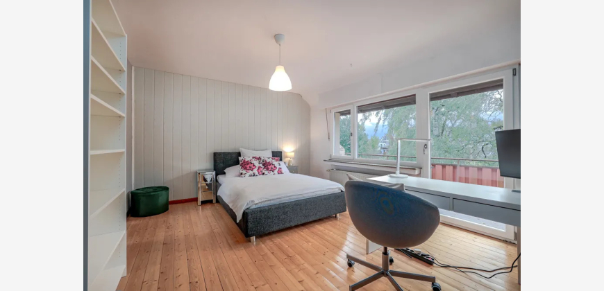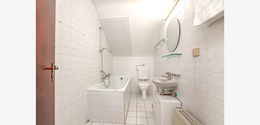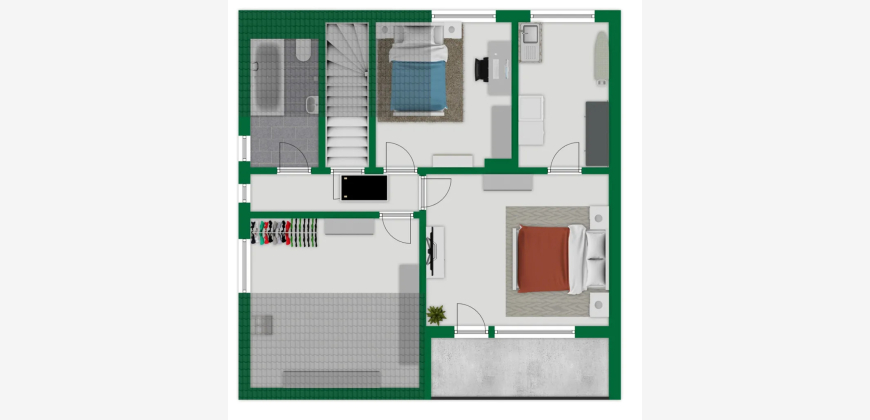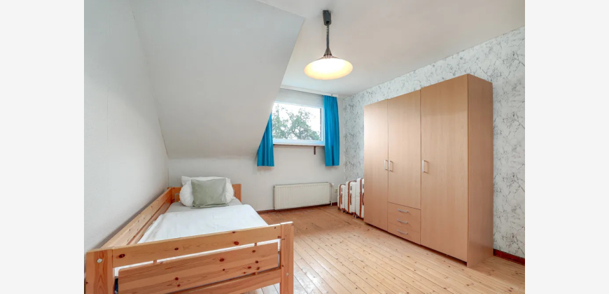 Im Obergeschoss befindet sich ein großes Schlafzimmer mit direktem Zugang zu einem weiteren Balkon. Ein kleineres Zimmer, derzeit als Küche genutzt, kann flexibel umgestaltet werden. Zwei weitere Zimmer sowie ein vollwertiges Badezimmer komplettieren diese Ebene.