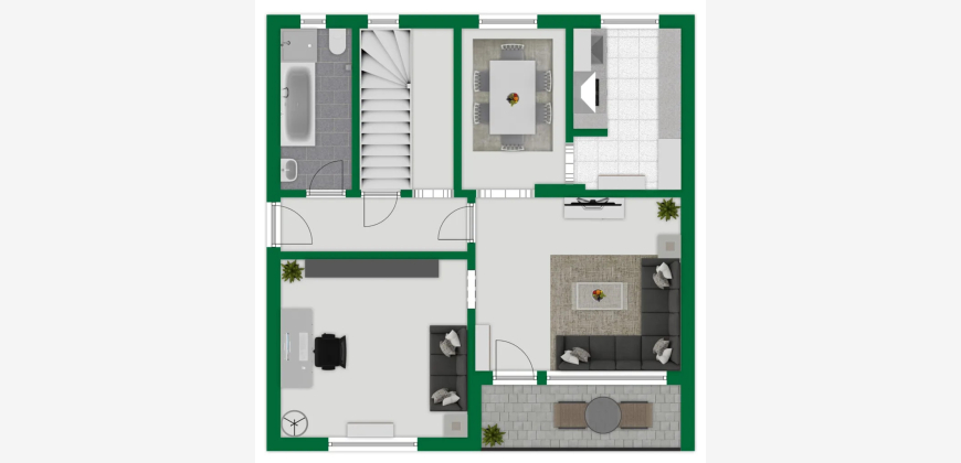 Über ein paar Stufen gelangen Sie zur Eingangstür, die durch das schützende Vordach bei jedem Wetter einen trockenen Zugang zum Haus bietet. Die Überdachung verleiht dem Eingangsbereich zusätzlich einen einladenden Charakter und bietet auch Raum für dekorative Elemente, um Gäste stilvoll zu empfangen.