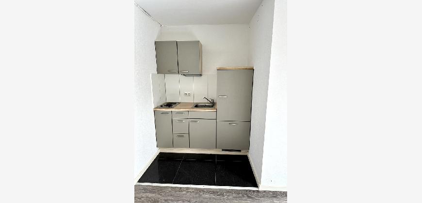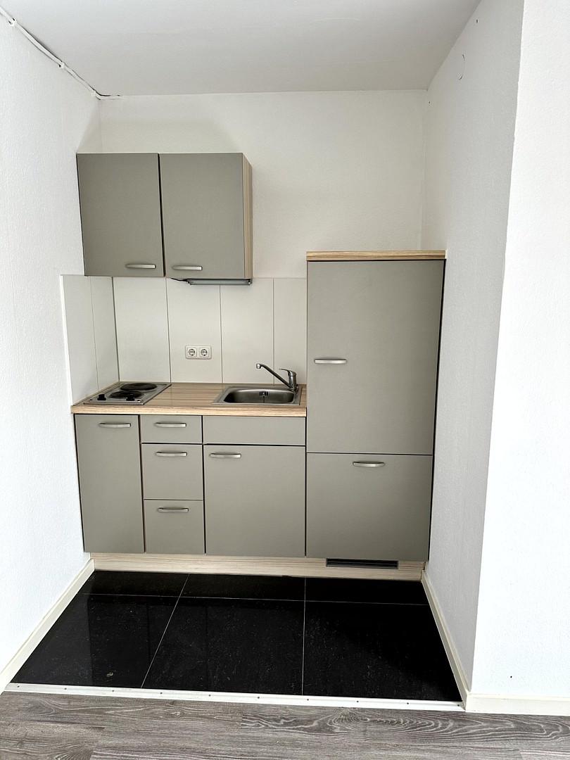 Singleküche mit zwei Herdplatten und Kühlschrank. Waschmaschine und Trockner mit Münzbetrieb stehen im Keller zur Verfügung.