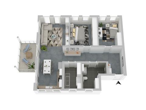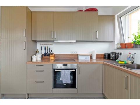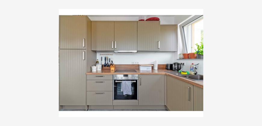 Die Wohnung besteht aus einem hellen Wohn/Essbereich mit offenen Kochbereich und integrierter Einbauküche sowie einem Zugang auf den sonnigen Balkon. Von der zentralen Diele erreichen Sie das geräumige Tageslichtbad mit Wanne und Dusche, das Schlafzimmer, ein helles Kinderzimmer/Büro. Ebenso verfügt die Wohnung im Eingangsbereich über Platz für eine Garderobe sowie einen Hauswirtschaftsraum, indem auch eine Waschmaschine und Wäschetrockner angeschlossen werden können.