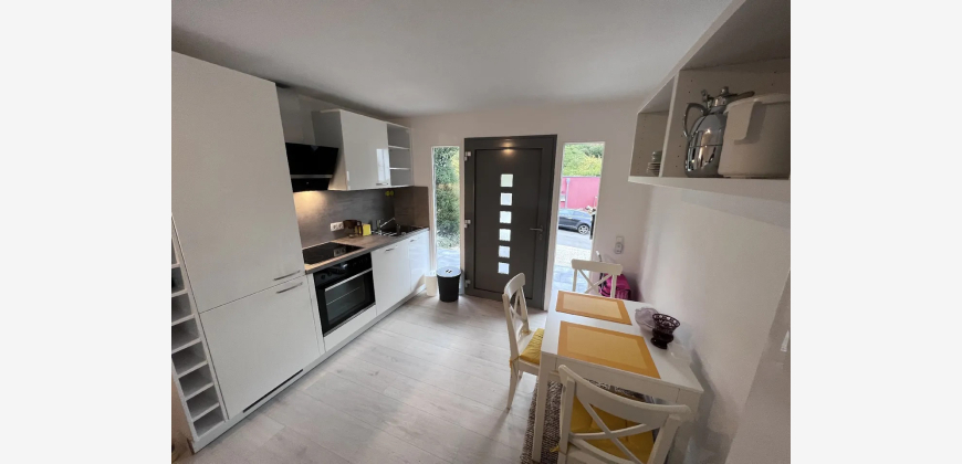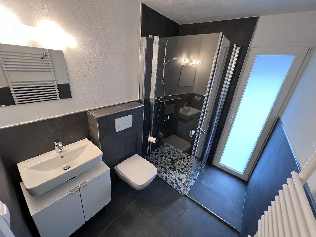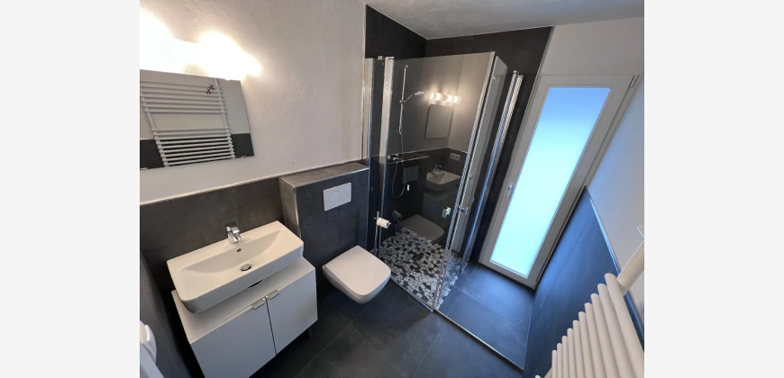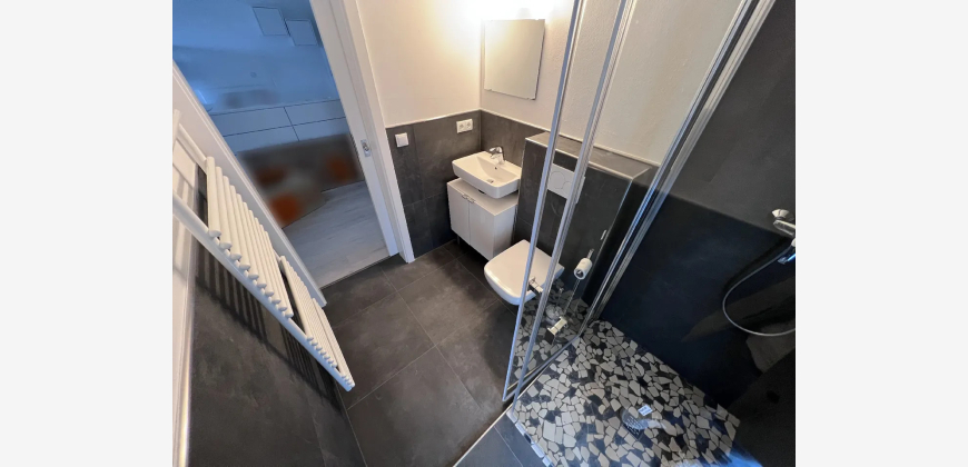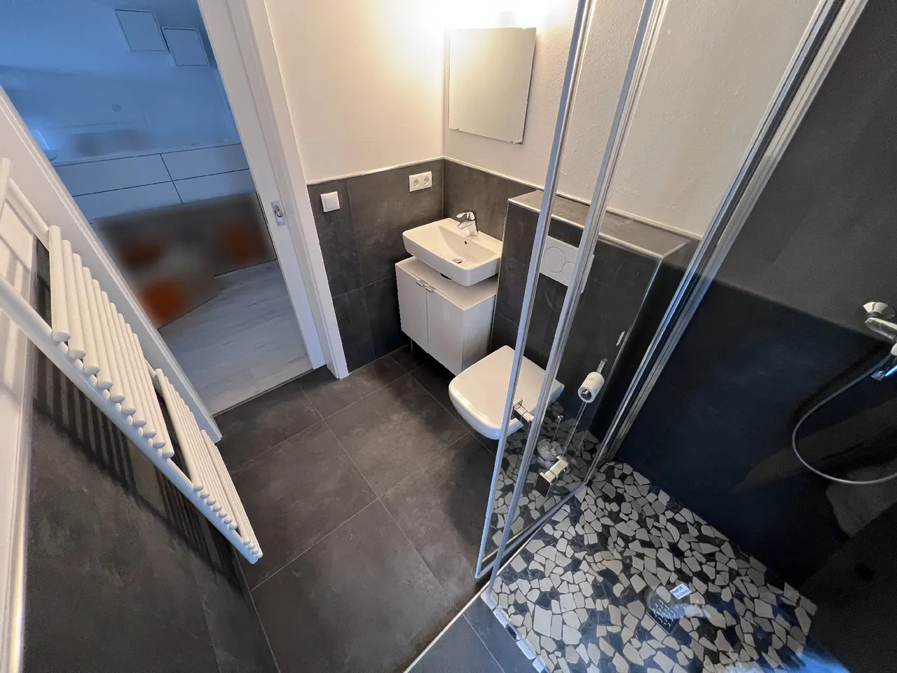 Das Badezimmer ist funktional ausgestattet und verfügt über ein Fenster, eine Dusche sowie ein Waschbecken. Die Küche bietet eine umfassende Ausstattung mit vier Cerankochfeldern, Backofen, Kühlschrank, Spülmaschine und Dunstabzugshaube und erfüllt damit alle Anforderungen des täglichen Bedarfs.