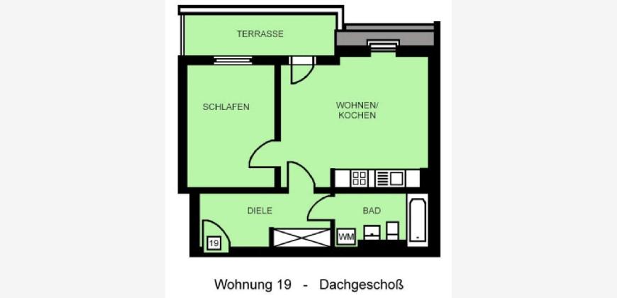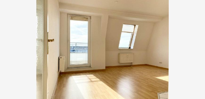 Zum Verkauf steht eine seit 2001 vermietet Eigentumswohnung im Dachgeschoss. Die Wohnung ist sehr gepflegt, verfügt über einen Balkon mit herrlichem Ausblick, offener Küche und einem Tiefgaragenstellplatz. Die gesamte Wohnanlage ist gut bewirtschaftet, es gibt nur wenig Leerstand im Karree.