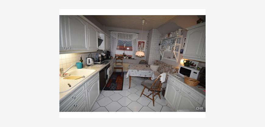 Kommen wir nun in den gemütlichen Wohnbereich im Obergeschoss. Hier gibt es eine Wohnküche incl. Einbauküche und einen Sitzbereich für das morgentliche Frühstück. Weiter kommen wir in das Wohnzimmer. Hier wurde das Fachwerk freigelegt, welches den Wohnbereich und den Essbereich optisch unterteilt. Im Wohnzimmer sorgt ein Kaminofen an kalten Tagen für zusätzlich gemütliche Atmosphäre.