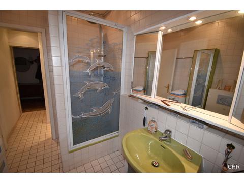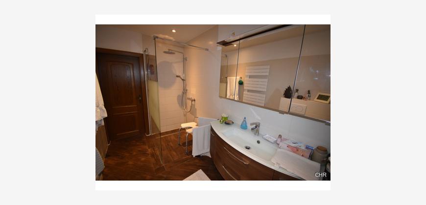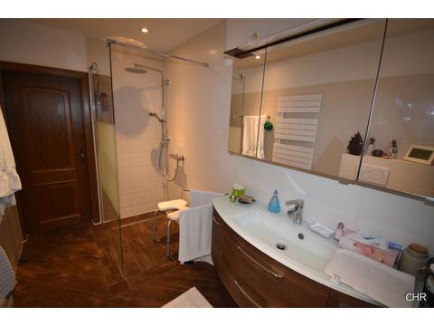 Hier im Obergeschoss wurde ein neues modernes Badezimmer eingebaut, ausgestattet mit barrierefreier Dusche und wandhängendem WC.