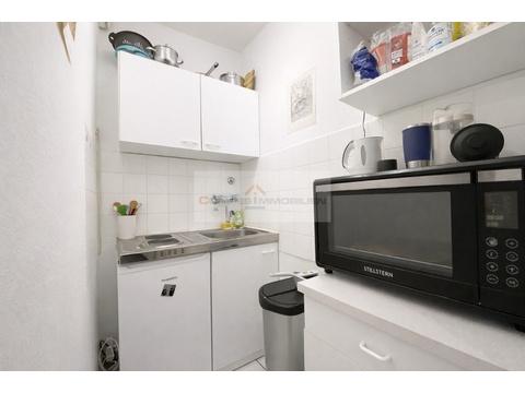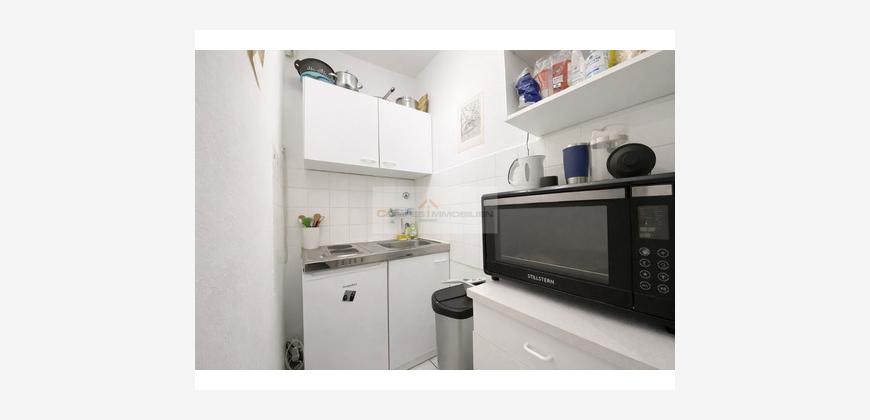 Der Wohnbereich ist geschmackvoll möbliert und bietet eine angenehme Kombination aus Wohn-, Schlaf- und Arbeitsmöglichkeiten. Auf der linken Seite befindet sich eine praktische Kochnische mit eingebauter Pantryküche, die funktional in den Raum integriert ist.