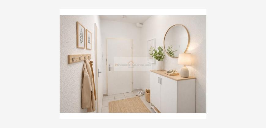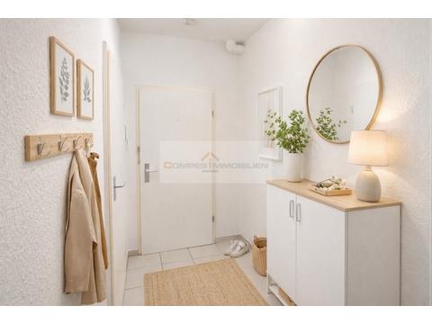Über den kompakten Flur mit Laminatboden sind sämtliche Bereiche der Wohnung bequem erreichbar. Rechterhand liegt das innenliegende Badezimmer, ausgestattet mit WC, Waschbecken sowie einer Duschbadewanne. Geradeaus öffnet sich der helle Wohn- und Schlafbereich mit Laminatboden und großzügiger Fensterfront. Von hier aus besteht direkter Zugang zur nach Süden ausgerichteten Loggia mit Blick ins Grüne – ein attraktiver Rückzugsort zum Entspannen.