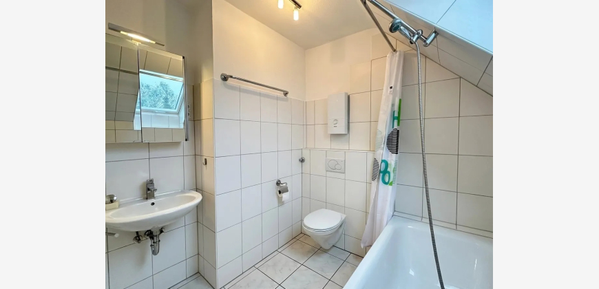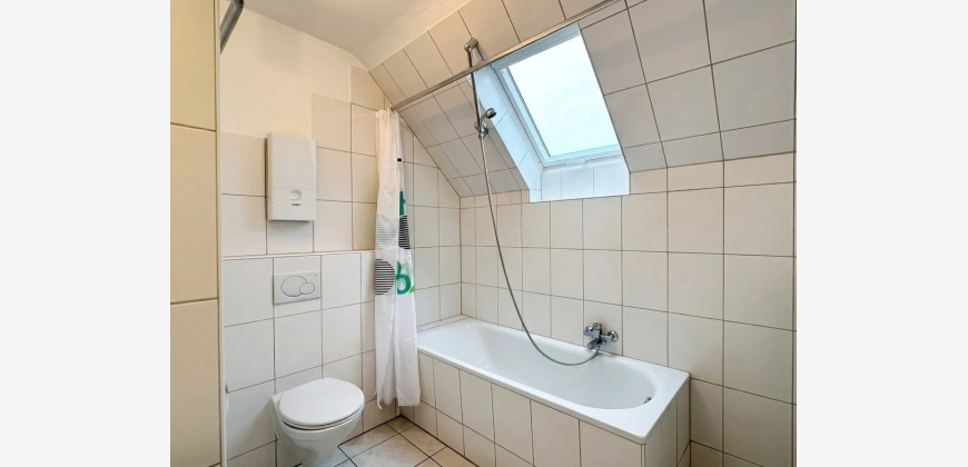 Das Badezimmer ist mit einer Badewanne ausgestattet und verfügt ebenfalls über ein Dachflächenfenster, was für gute Belichtung und Belüftung sorgt.