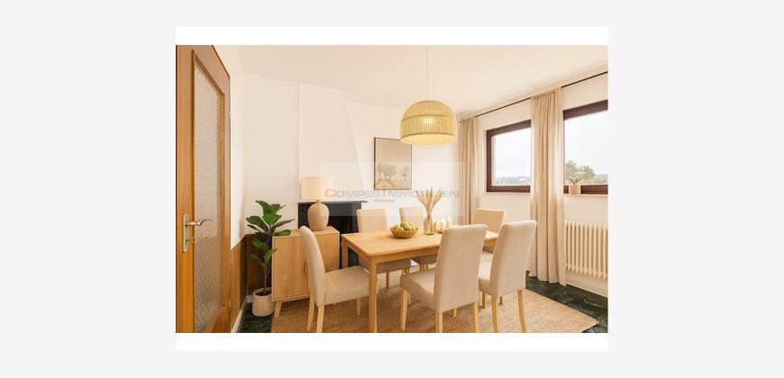 Auf der rechten Seite befindet sich das Wohn- und Esszimmer mit Fliesenboden. Der Essbereich ist teilweise durch eine Wand vom Wohnbereich abgetrennt und bietet ausreichend Raum für gesellige Runden und entspannte Abende.