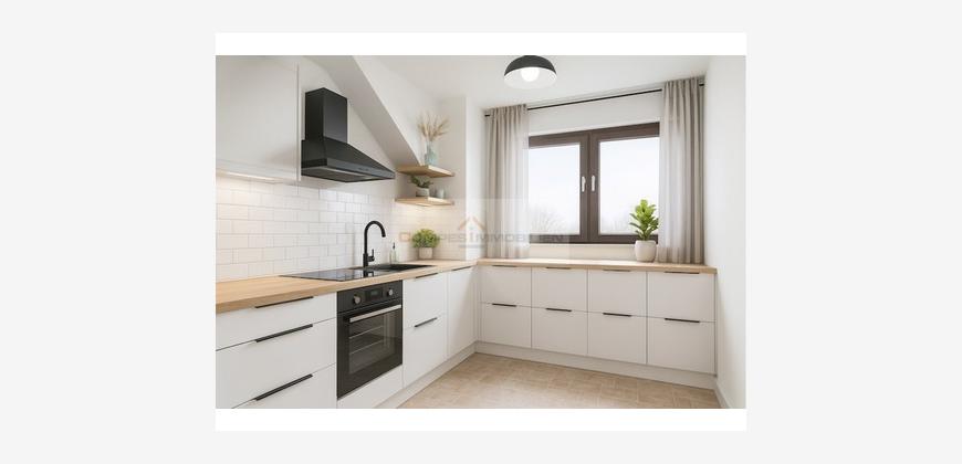 Direkt daneben befindet sich die helle Küche, ausgestattet mit PVC-Boden in Fliesenoptik, einer gepflegten Einbauküche sowie Kühlschrank – funktional, einladend und sofort nutzbar.