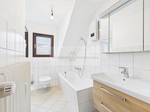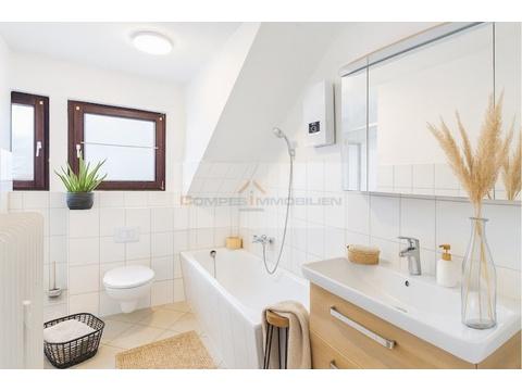Das helle Tageslichtbadezimmer verfügt über zwei Fenster, eine große Duschkabine, Badewanne, WC und Waschbecken – ein komfortabler Raum, der keine Wünsche offen lässt.