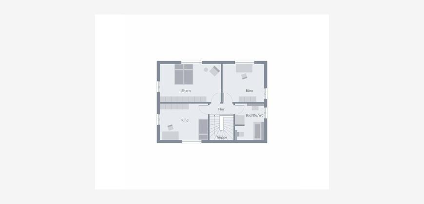 Über die großzügige Diele gelangen Sie ins Dachgeschoss, wo jedes Detail auf Komfort und Funktionalität abgestimmt ist: ein helles Kinderzimmer, ein gemütliches Elternschlafzimmer, ein modernes Büro sowie ein komfortables Bad mit Dusche, Wanne und WC.