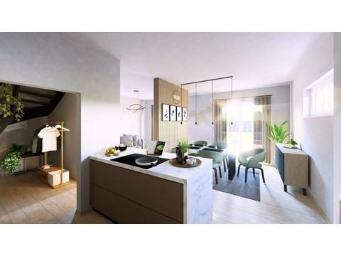 Im Inneren erwartet Sie ein lichtdurchfluteter Wohn-, Ess- und Kochbereich, der sich offen zum Garten hin entfaltet - ideal für gemeinsame Stunden mit Familie und Freunden oder entspannte Momente der Ruhe. Praktische Details wie ein separater Hauswirtschaftsraum und ein Gäste-WC runden das Erdgeschoss ab.