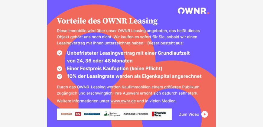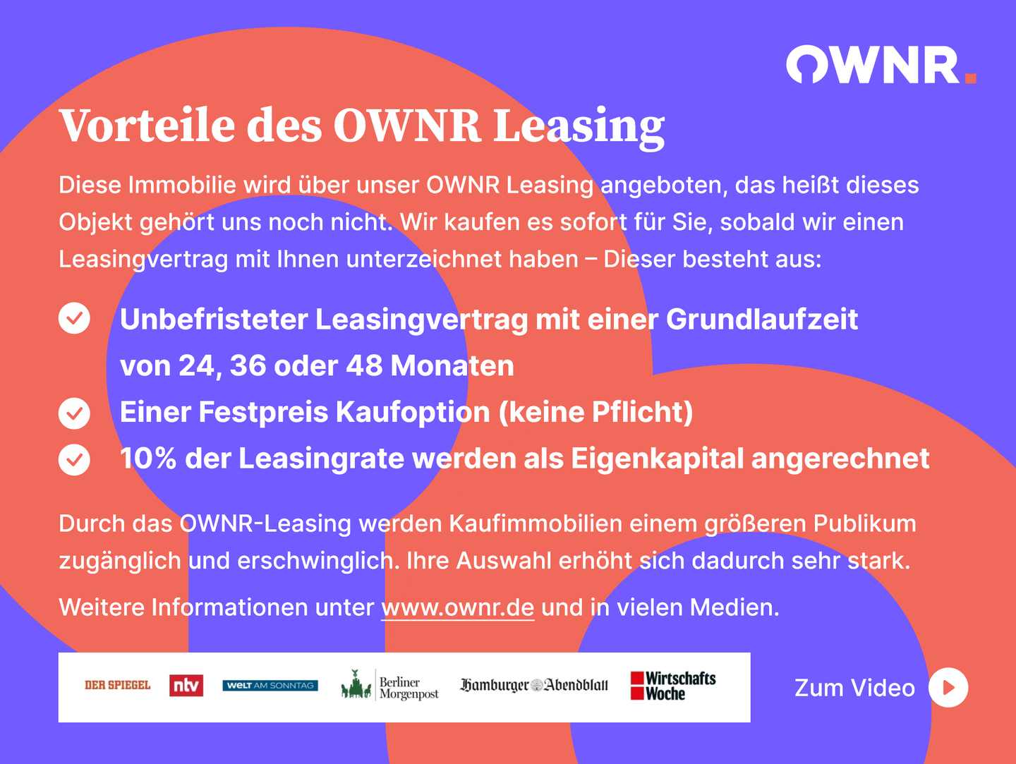 Das Rundum-sorglos-Renovierungspaket ohne eigene Anstrengungen: Alle OWNR-Immobilien werden nach dem OWNR-Standard renoviert. Zur Innenausstattung gehört eine Einbauküche. Zudem sind die Wände weiß gestrichen und die Immobilie wird vor Übergabe gründlich gereinigt. Wir bei OWNR kümmern uns regelmäßig um Renovierungsarbeiten und binden dich gerne in diesen Prozess ein. Wir bemühen uns, Deine Wünsche zu berücksichtigen; bitte beachte, dass dies möglicherweise eine Anpassung der Leasingrate im überschaubaren Rahmen nach sich ziehen kann.