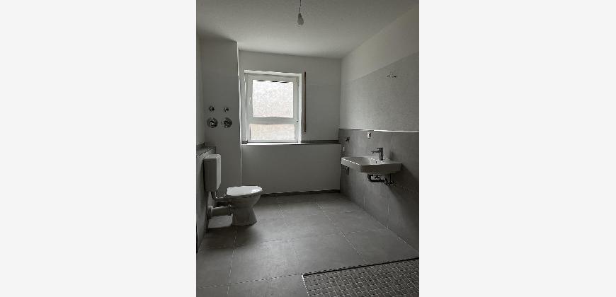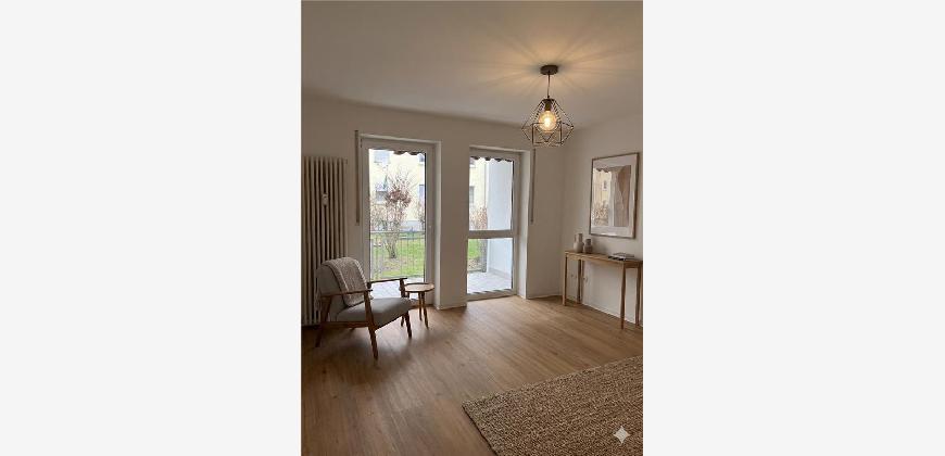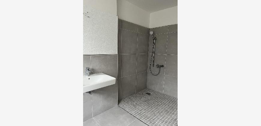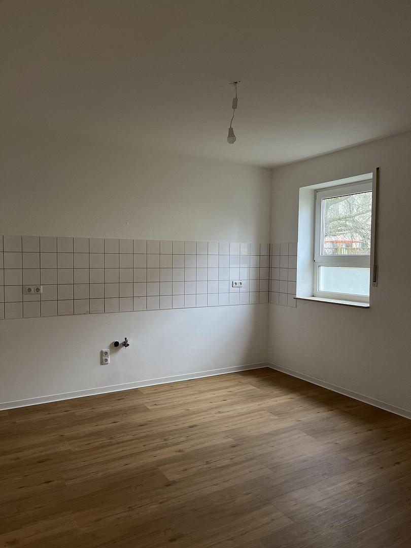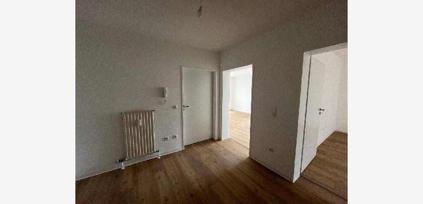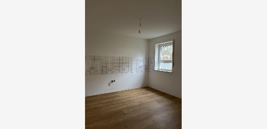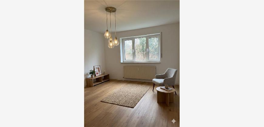 Die frisch sanierte 2,5-Zimmer-Erdgeschosswohnung besticht durch helle, moderne Räume mit Vinylboden und weißen Wänden. Das Tageslichtbad ist mit grauen Fliesen ausgestattet und verfügt über eine großzügige barrierefreie Dusche. Vom Wohnzimmer aus gelangen Sie auf den Balkon.