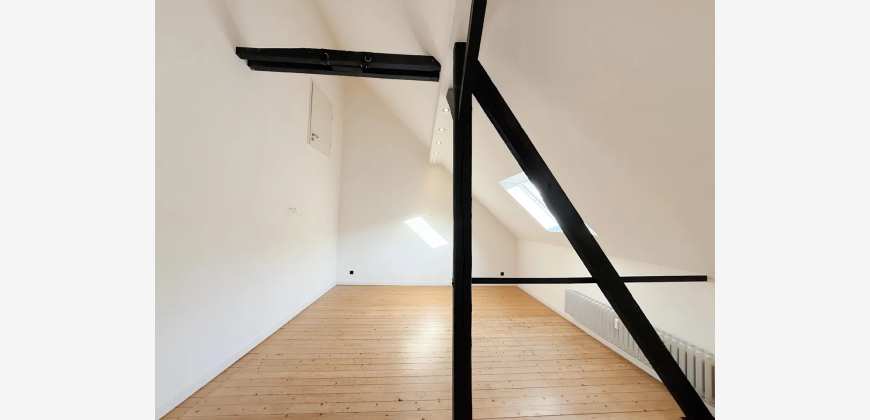 Ein besonderes Highlight ist das ausgebaute Dachgeschoss: sichtbare Balken, hohe Decken und ein großes Dachflächenfenster verleihen dem Raum einen loftartigen Charakter perfekt als Atelier, zusätzliches Schlafzimmer oder individueller Rückzugsort.