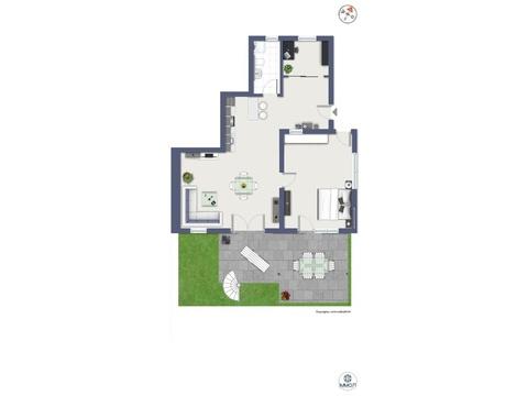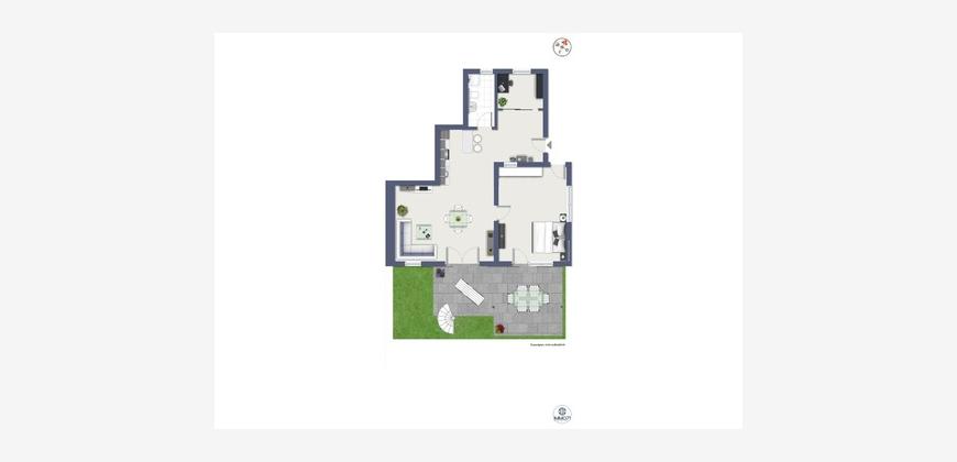 Der großzügige Eingangsbereich bietet Platz für einen kleinen Homeoffice-Bereich. Von dort gelangen Sie in die offene, im Mietpreis enthaltene Küche mit Theke/Bar sowie in das helle, geräumige Wohnzimmer und das große Schlafzimmer. Beide Räume führen direkt auf die offene Terrasse mit einem kleinen Gartenbereich – ideal für entspannte Stunden im Freien.