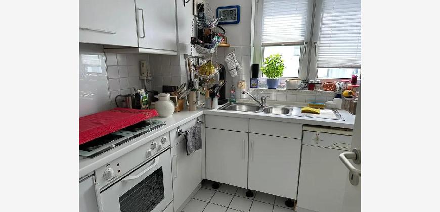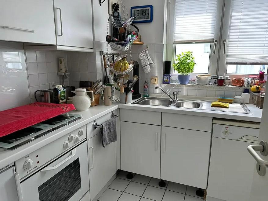 Zur Wohnung gehören eine Einbauküche mit Siemens Herd mit Cerankochfeldern und Backofen (im Bild nicht zu sehen, da das Bild von 2023 ist) und eine AEG Spülmaschine. Ein großer Standkühlschrank (150cm) komplettiert die Küchenausstattung (im Bild nicht zu sehen, da das Bild von 2023 ist).