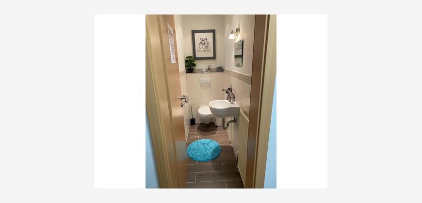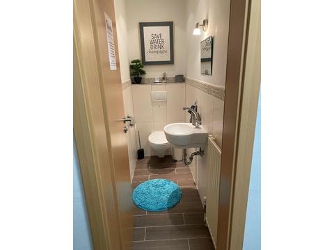 Ganz praktisch befinden sich ebenfalls von der Diele aus erreichbar das Badezimmer, ein Gäste-WC sowie ein Abstellraum, der wertvollen Stauraum für den Haushalt schafft.