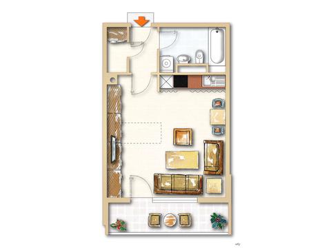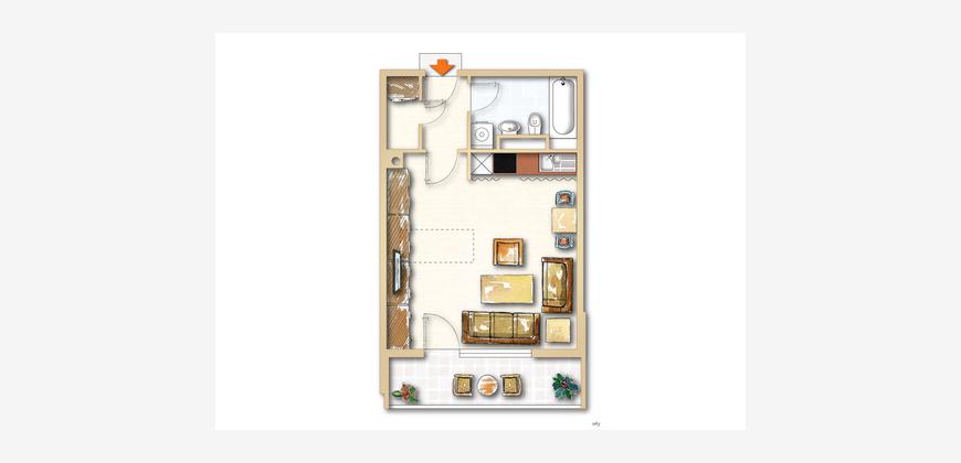 Rund 41 m2 sind verteilt auf 1 kleine Eingangsdiele mit separatem Abstellbereich, ein großzügiger Wohn-, Ess- und Schlafbereich mit optisch abgetrennter Kochnische, Bad mit Badewanne, WC & Waschmaschinenanschluss und Loggia.