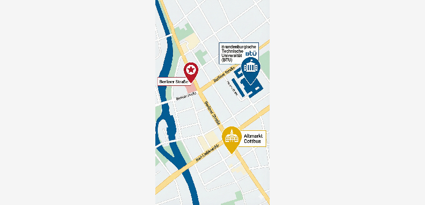 Die BTU ist nur wenige Minuten mit dem Fahrrad oder den öffentlichen Verkehrtsmitteln entfernt und der Altmarkt ist fußläufig zu erreichen.