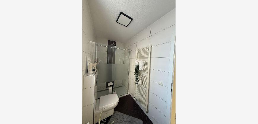 Das Badezimmer ist hochwertig ausgestattet mit einer großen Dusche mit Glasabtrennung, einem wandhängenden-WC,einem Waschtisch, einem Spiegelschrank sowie einem Handtuchheizkörper.