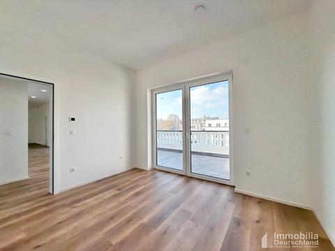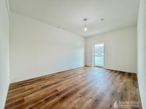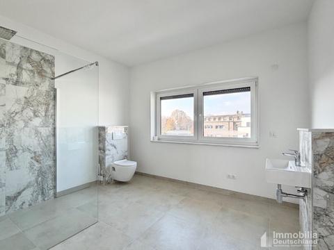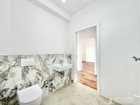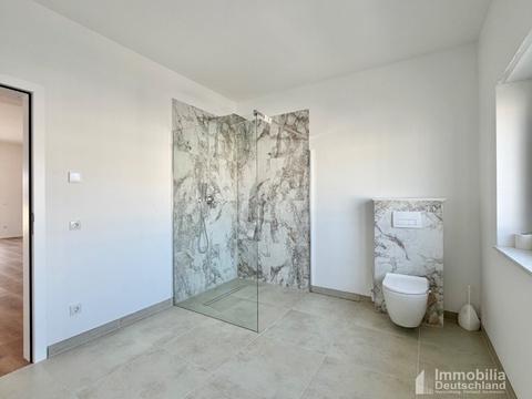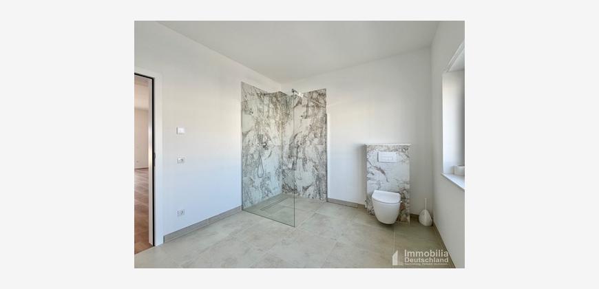 Der offene Wohn- und Küchenbereich mit ca. 47 m² präsentiert sich lichtdurchflutet und großzügig, getragen von bodentiefen, dreifach verglasten Fensterfronten. Die Küche lässt sich bei Bedarf durch eine zusätzliche Wand elegant vom Wohnraum abtrennen. In allen Wohnräumen unterstreicht ein hochwertiger brauner Vinylboden die moderne, warme Atmosphäre, während die Badezimmer mit edlen Fliesen ausgestattet sind.