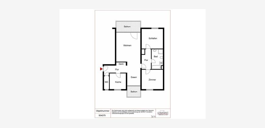 In diesem gepflegten 4-geschossigen Mehrfamilienhaus können Sie sich richtig wohlfühlen. Die Wohnlage ist ruhig mit viel Grün und ohne Durchgangsverkehr. Eine sehr gut geschnittene 3-Zimmer-Wohnung im 1. Obergeschoss wartet auf neue Eigentümer. Zwei Balkone mit Blick ins Grüne geben Ihnen die Gelegenheit sowohl beim Frühstück als auch zum Feierabend die Sonne zu genießen. Die Räume sind hell und großzügig geschnitten. Die Diele und ein Flur bieten sehr gute Abstellmöglichkeiten. Das fast 26 qm große Wohnzimmer ist offen zum Essplatz mit über 11 qm gestaltet. Der durchgängig helle Bodenbelag ist in gepflegtem Zustand. Ein separates Gäste-WC ist vorhanden. In das Badezimmer mit Wanne und Dusche sollte investiert werden. Die Küchenmöbel gehören den Mietern und könnten übernommen werden. Die Wohnung ist spätestens Anfang Juni beziehbar. Ein weiteres Plus ist ein geräumiger, gemauerter Keller und ein Tiefgaragenplatz, der direkt vom Haus aus erreicht werden kann.
