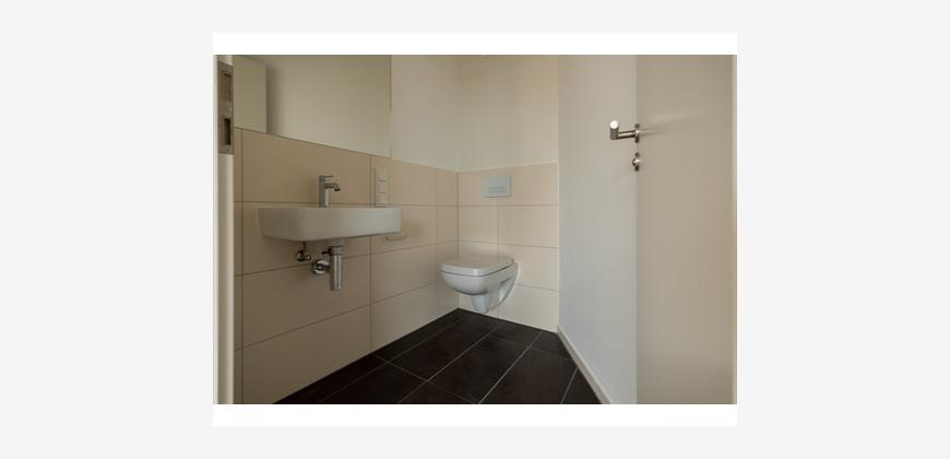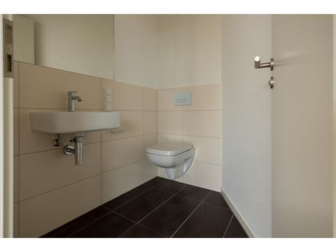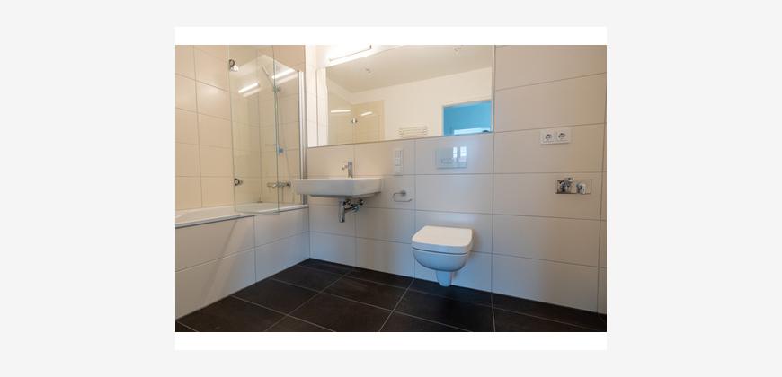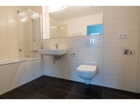 Das Bad mit Badewanne und Waschmaschinenanschluss ist modern gestaltet und mit hochwertigen Armaturen ausgestattet. Zusätzlich steht Ihnen ein Gäste-WC zur Verfügung.