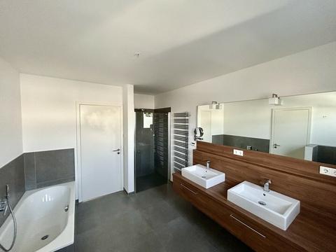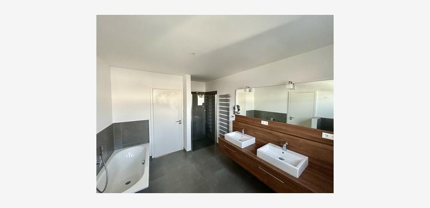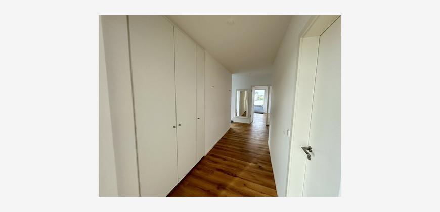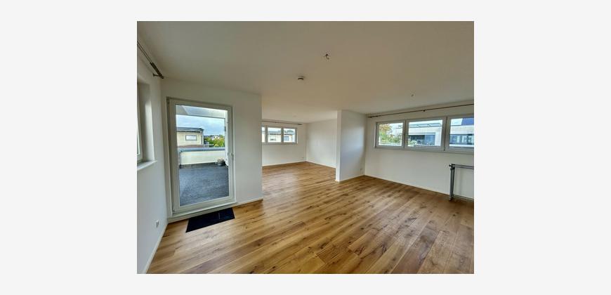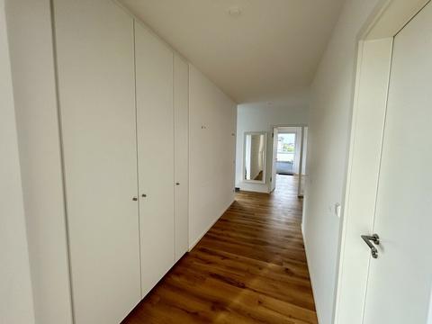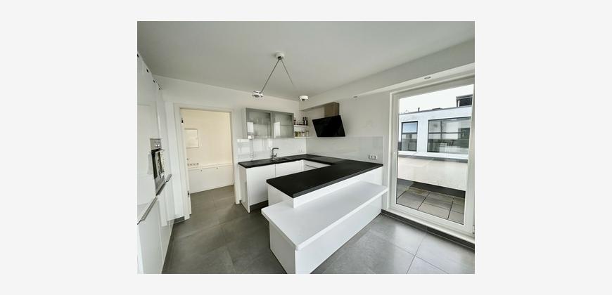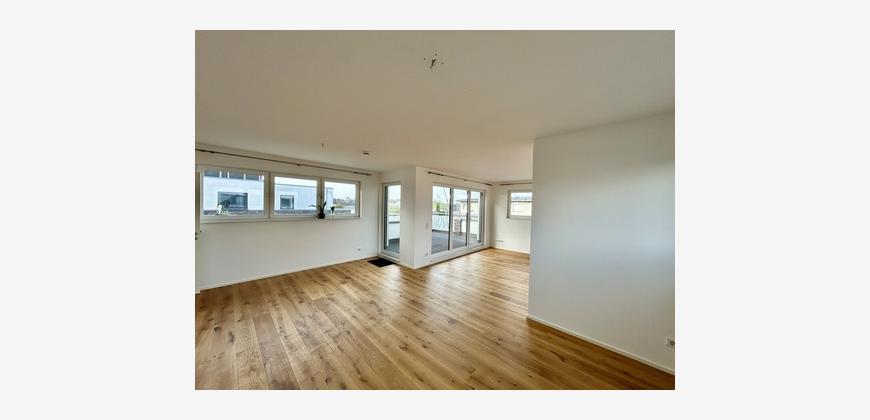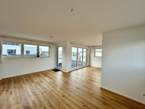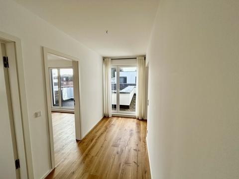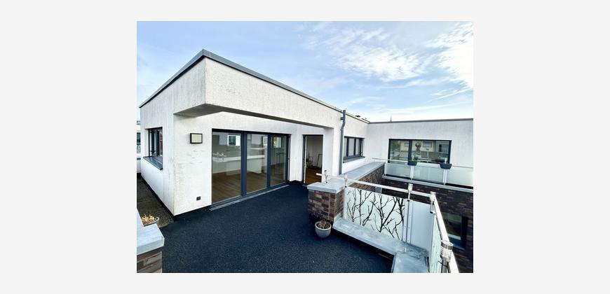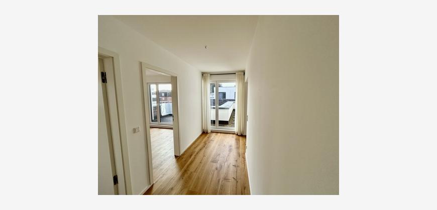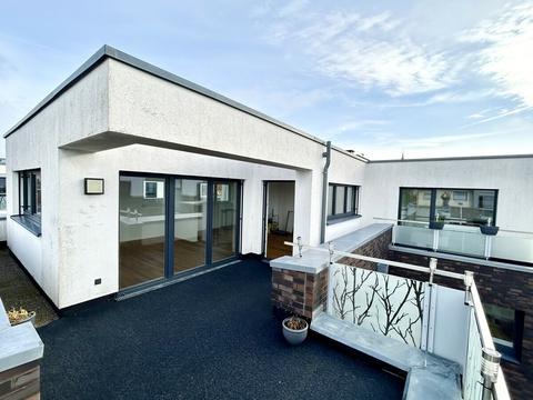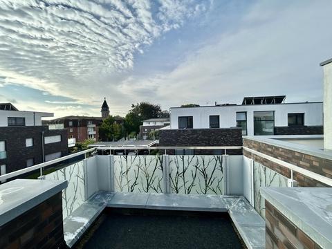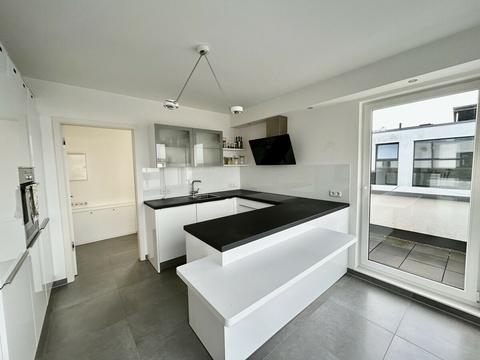 Exklusives Penthouse mit drei Dachterrassen und ansprechend moderner Innenausstattung. Die Wohnung befindet sich im Staffelgeschoss ohne weiteren Nachbarn. Das Penthouse ist aufgeteilt in ein geräumiges Wohn- Esszimmer mit angrenzender offener Küche, einen Abstellraum, ein Gäste-WC, ein Bad mit 2 Waschtischen, Badewanne und Dusche, einem großzügigem Flur und zwei Schlafzimmern. Aus dem Wohnbereich ist der barrierefreie Zutritt zu einer großen Südterrasse möglich. Angrenzend an die Küche und dem kleineren Schlafzimmer befinden sich weitere Dachterrassen. Die Waschmaschine und den Trockner schließen Sie bequem im praktischen Hauswirtschaftsraum an.