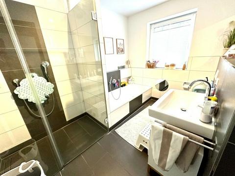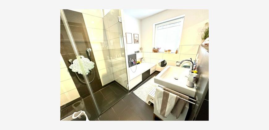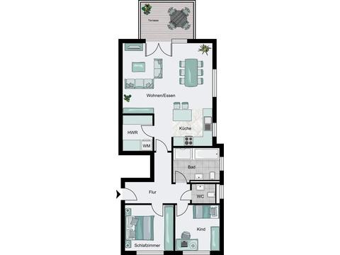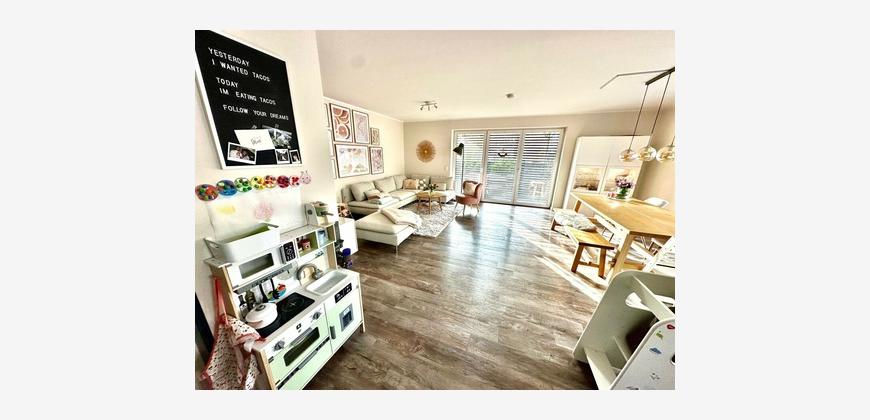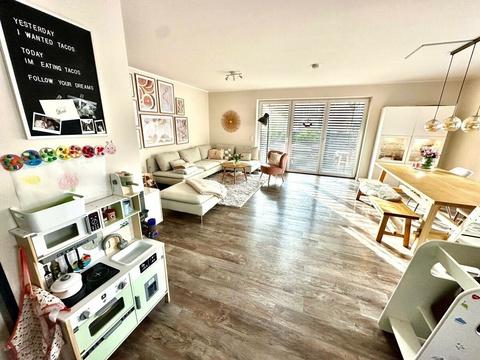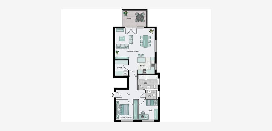 Die Erdgeschosswohnung ist optimal aufgeteilt und bietet ein Wohn-/Esszimmer mit offener Küche, Terrasse, Flur, Schlafzimmer, Bad mit Dusche und Wanne, Gästezimmer/Arbeitszimmer, Hauswirtschaftsraum mit Platz für Waschmaschine, Trockner und zusätzlicher Abstellfläche, sowie ein Gäste-WC. Der zur Wohnung gehörende Kellerraum bietet ca. 6 m² zusätzliche Nutzfläche zum Lagern. Zur Wohnung gehören ein Tiefgaragenstellplatz (monatlich 60,00€) und ein Außenstellplatz direkt neben der Wohnung für (monatlich 25,00 €). Für die Fahrräder steht ein ausreichend dimensionierter Fahrradunterstand zur Verfügung.