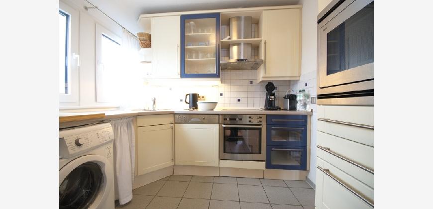 Apartment on the first storey of a two-family building, enjoying a quiet and idyllic location. A baker, discount supermarket and tram stop are around 10 to 12 minutes’ walk away, with a restaurant is only 120 metres away. 5 km from the A40 motorway and 6 km from the A42. The rent already includes service charges and heating costs, plus electricity. Regular cleaning of the apartment can be arranged if required. We have not yet received a copy of the energy certificate from the landlord, but it has been requested. The apartment is split across two levels, offering around 120 m² floor space. There is also a large balcony. On the lower level you will find the fully equipped open-plan kitchen, which includes a dishwasher, as well as the bathroom with bath, shower and WC and the spacious living/dining area, with its large dining table and corner sofa. You also access the sunny balcony from here. The upper level offers sleeping space for three people. There is also an additional WC. One of the bedrooms offers a divan bed (1.80m wide). A separate smaller room houses a single bed. A third bedroom can also be provided if required. Washing machine and internet access provided. Internetzugang Waschmaschine Spülmaschine Balkon Stellplatz