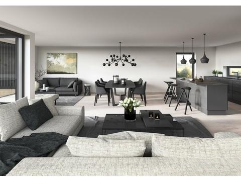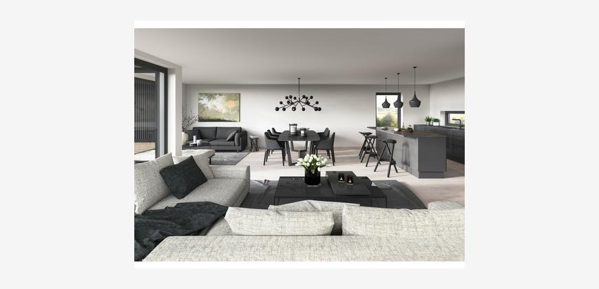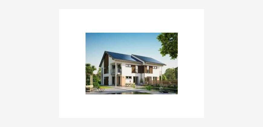 Das ist unser Doppelhaus . Hier sind in den jeweils knapp 80 qm großen Erdgeschossen die Übergänge fließend - und sorgen auf diese Weise für ein außergewöhnliches Wohn- erlebnis. Das zentral gelegene Treppenhaus trennt Eingangs- bereiche beziehungsweise Nutzräume mit HWR und Gäste-WC von dem hellen Wohn-Koch-Ess-Bereich, der mit seiner Größe von mehr als 45 qm den Mittelpunkt des Hauses bildet. Im Obergeschoss: ein Elternschlafzimmer mit inte- grierter Ankleide, zwei Kinderzimmer sowie ein Badezimmer mit Wanne, Dusche und WC.