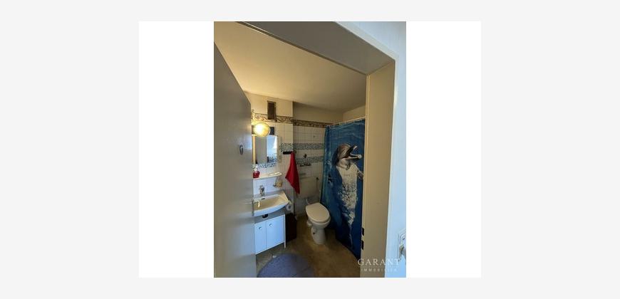 Das innenliegende Badezimmer ist mit einer Badewanne mit Duschgelegenheit ausgestattet, benötigt jedoch einige Renovierungsarbeiten, ebenso wie die Bodenbeläge und Teile der restlichen Wohnung.